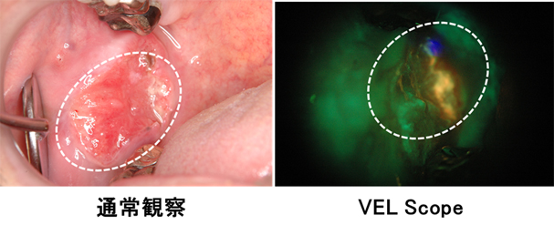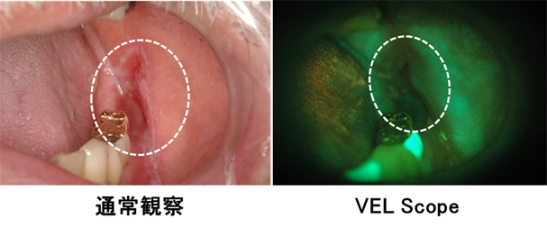 VEL scopeの利点として、侵襲がないこと、検査時間が数分と短時間で済むこと、取り扱いに特別な技術を必要としないこと、患者や術者の姿勢が制限されることがない事などがあげられ、容易に口腔内を観察する事が可能であり、前がん病変や口腔がんの検診に有効であると思われます。