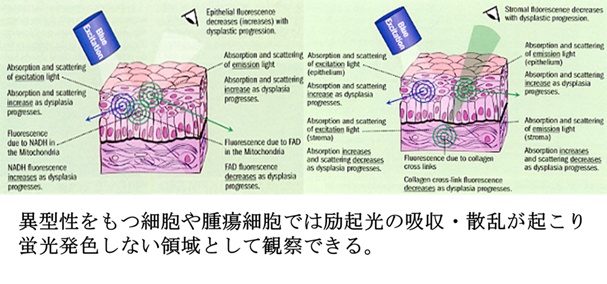 すなわち、上皮正常細胞では励起光に反応し、蛍光を発しますが、異型性をもつ細胞、あるいは腫瘍細胞では、細胞外基質などのコラーゲンが破壊されているような領域では細胞が蛍光を発することなく励起光を吸収し、黒く観察されるのです。