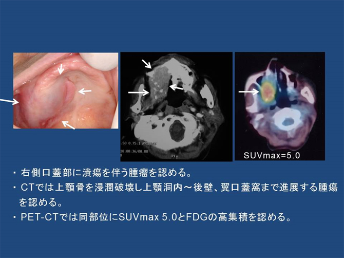 62歳の女性、10数年前に口底癌(腺様嚢胞癌)にて腫瘍切除するも、翌年に再発し、また、肺転移を認め、抗がん剤による治療を行うも腫瘍は消えず、肺の担癌状態にて経過観察を行われていたが、舌の違和感と口腔底にしこりを認めるようになり、CTおよびPET-CTの撮影によって再発を指摘され何らかの治療を求めて受診した。