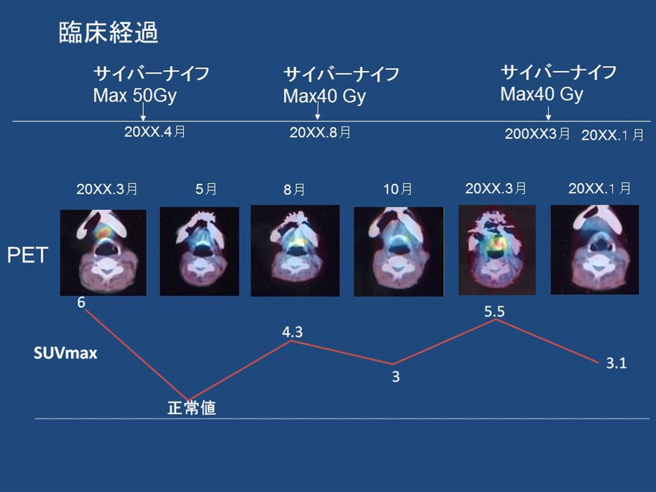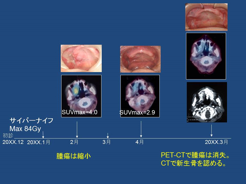 サイバーナイフ後、口腔内の腫瘍は消失しPET-CTでも原発巣のSUV値は正常を示している。CTでも原発巣部の腫瘍は消失し、新生骨を認め、頸部リンパ節に再発、転移は認められていない。